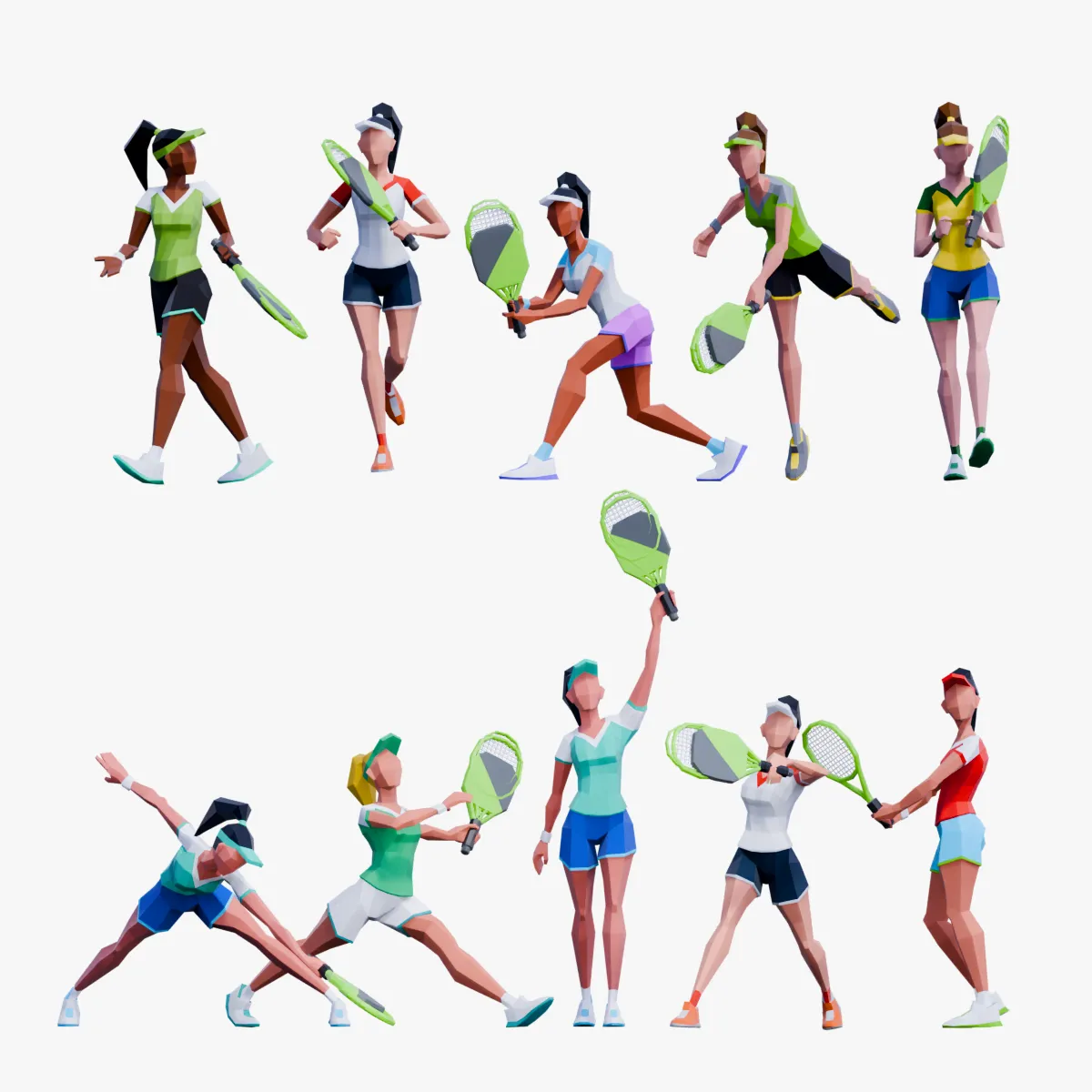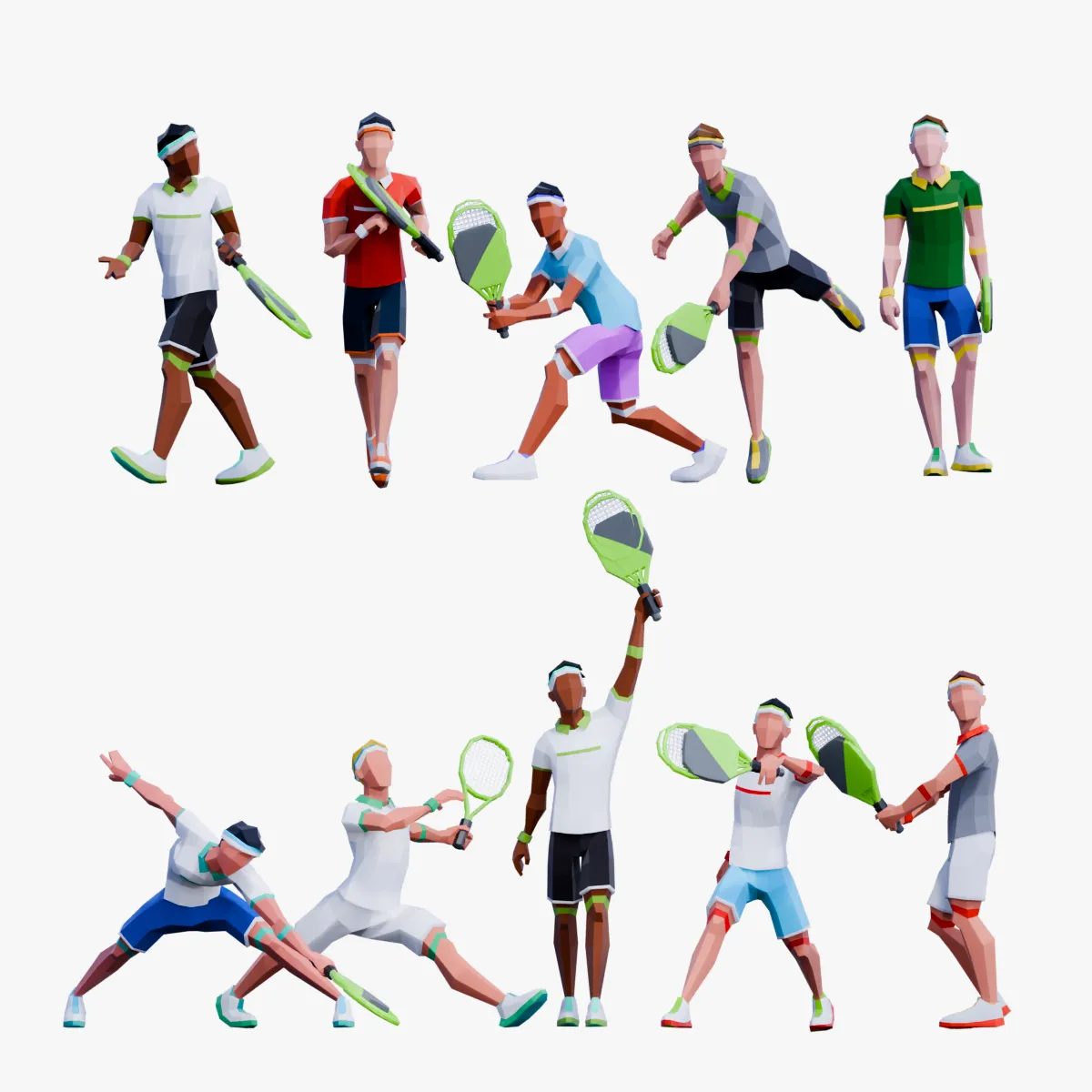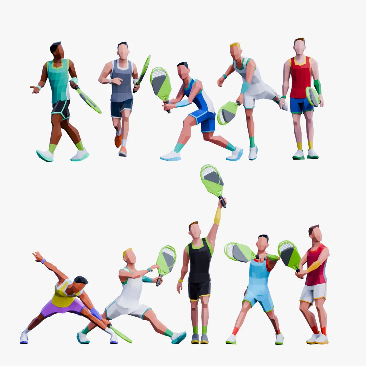 Low Poly style people posing for walking, running, stretching, idle, reaching and and more. Male and Female with different poses with three racquet included: Tennis, Padel and Badminton. Original file with all different objects in ordered grid.