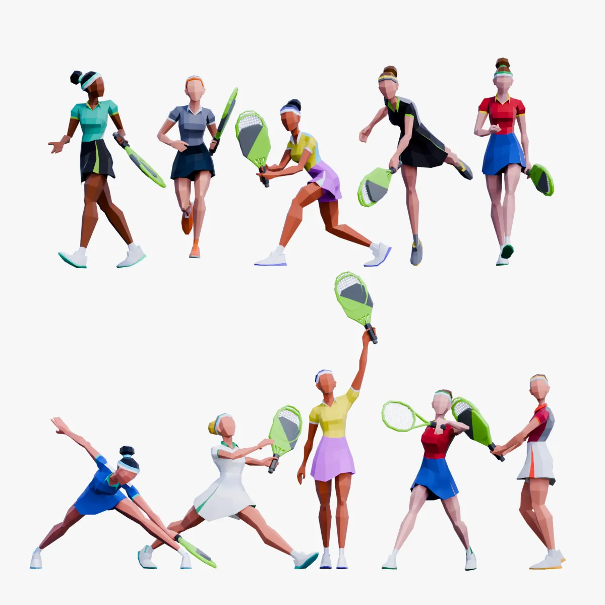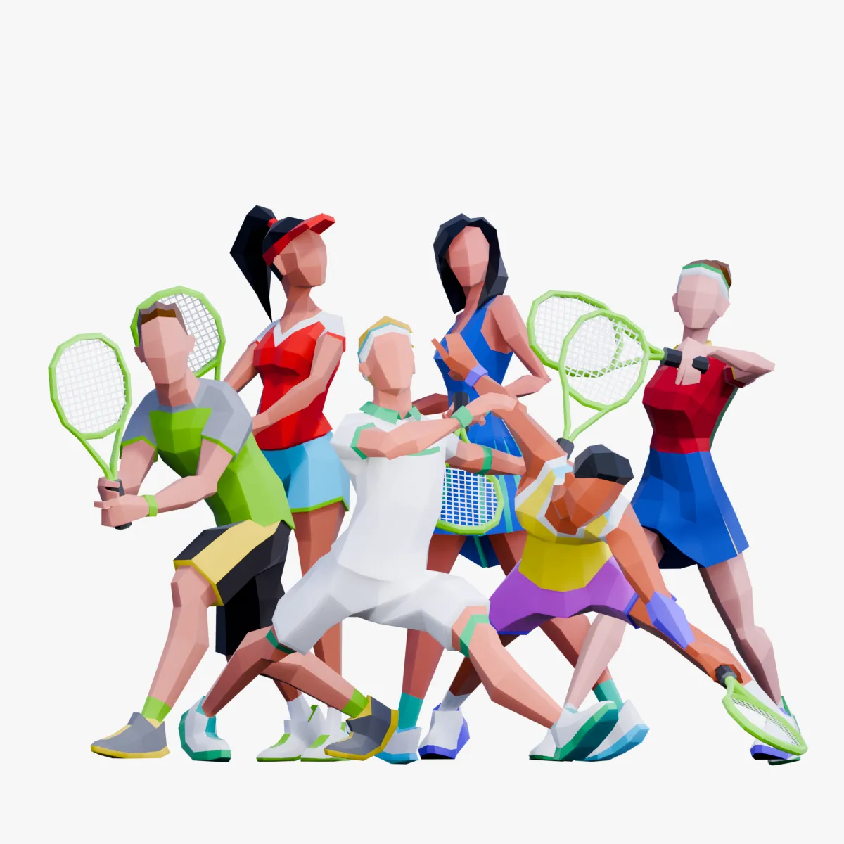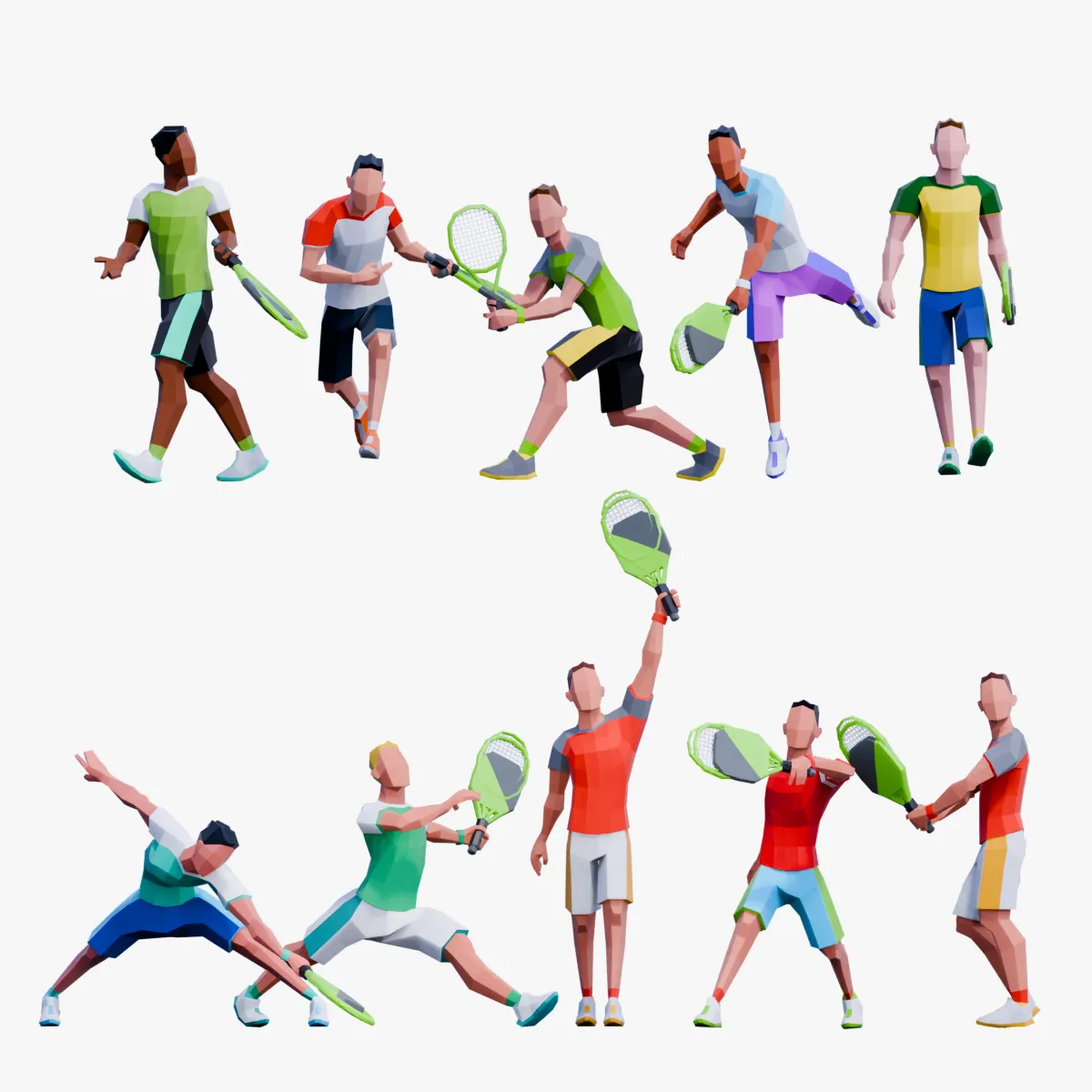 Low Poly style people posing for walking, running, stretching, idle, reaching and and more. Male and Female with different poses with three racquet included: Tennis, Padel and Badminton. Original file with all different objects in ordered grid.