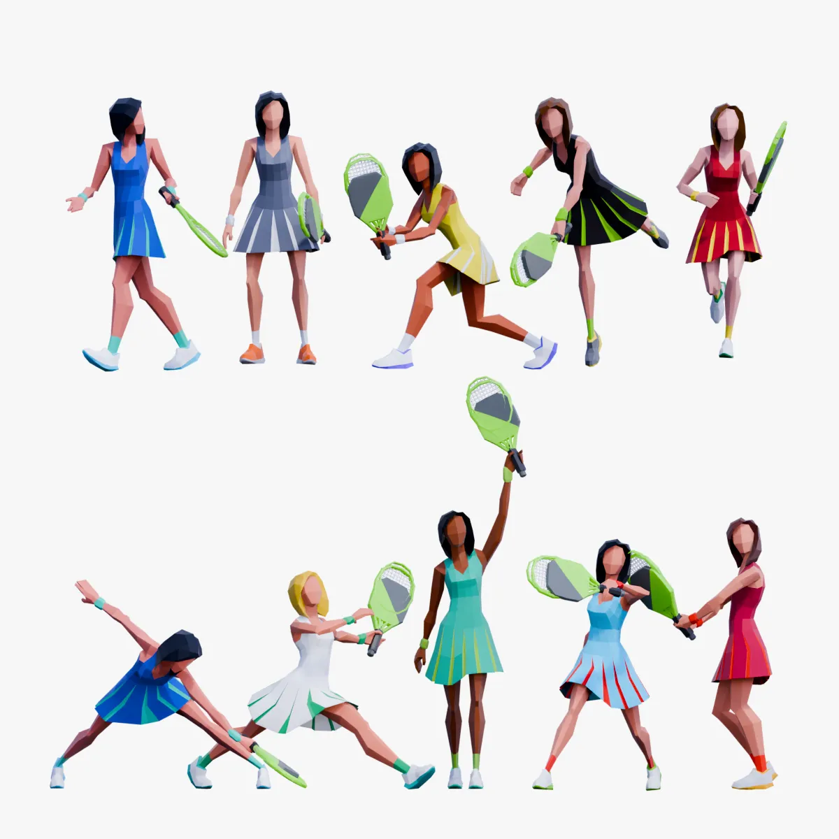 Low Poly style people posing for various situations like walking, running, standing, reaching, hitting and more. The pack includes 60 objects – 10 poses per character and 10 textures, 9 skins fro the characters and 1 texture for the racquets.